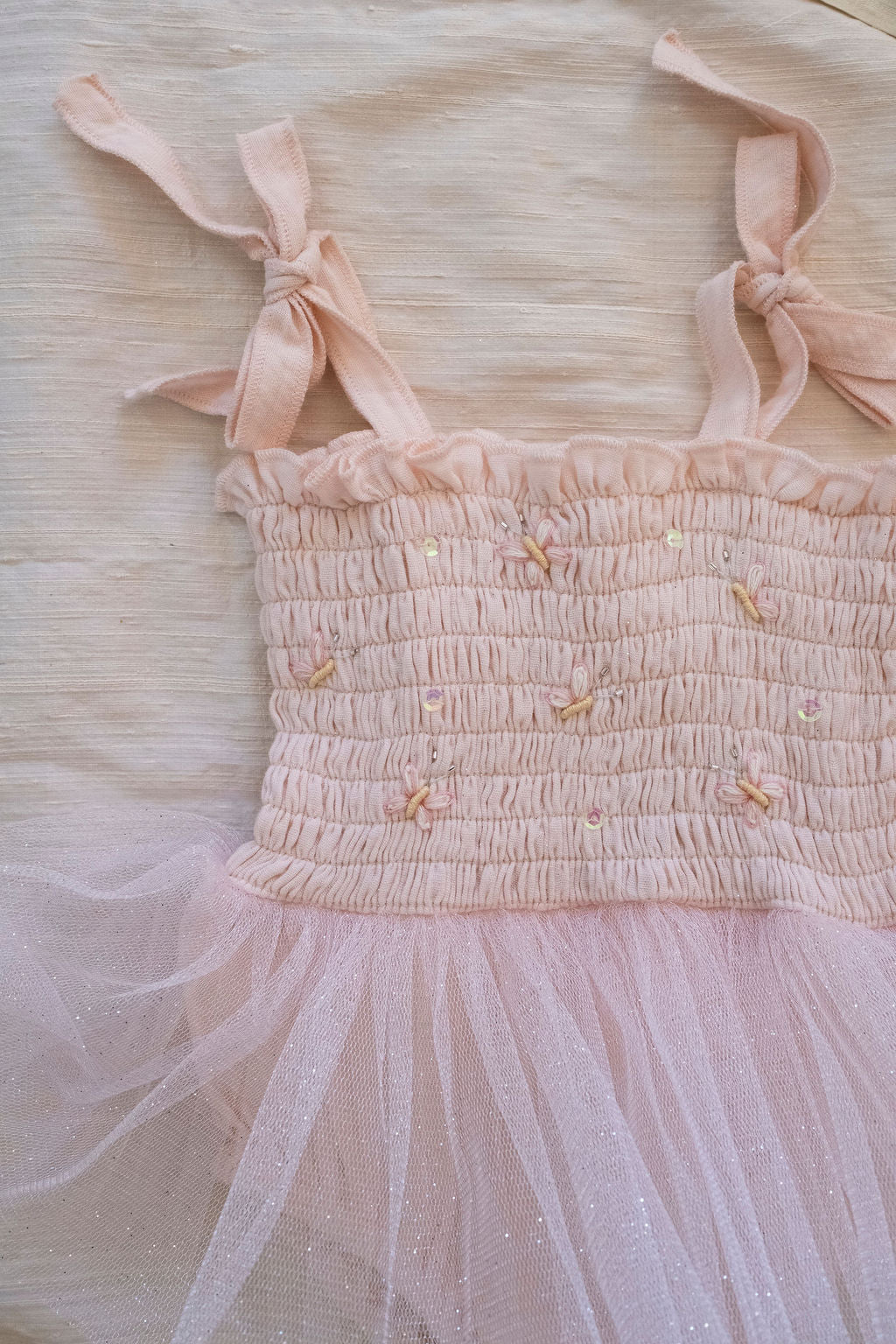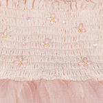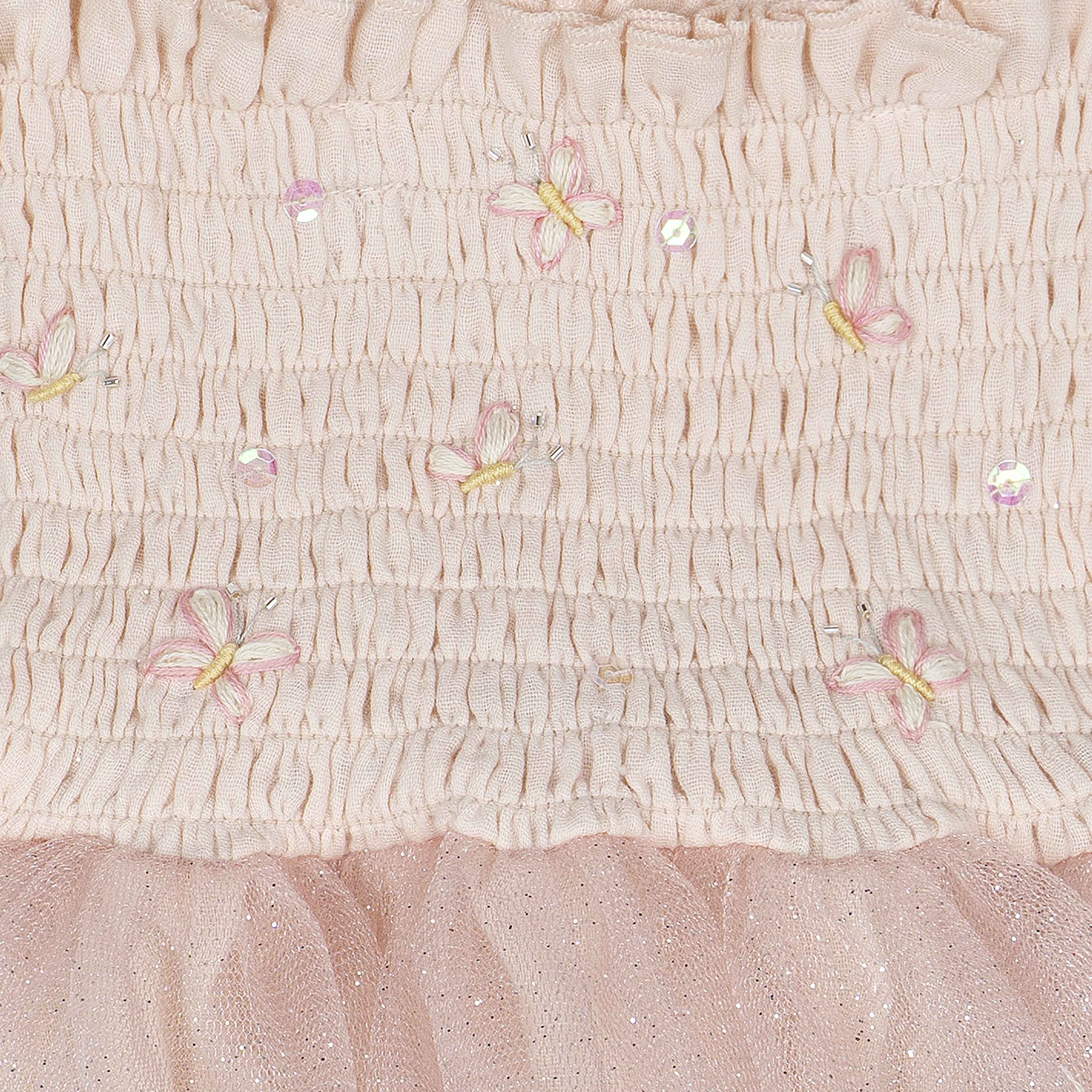 • Elasticized smocked bodice with butterfly accents