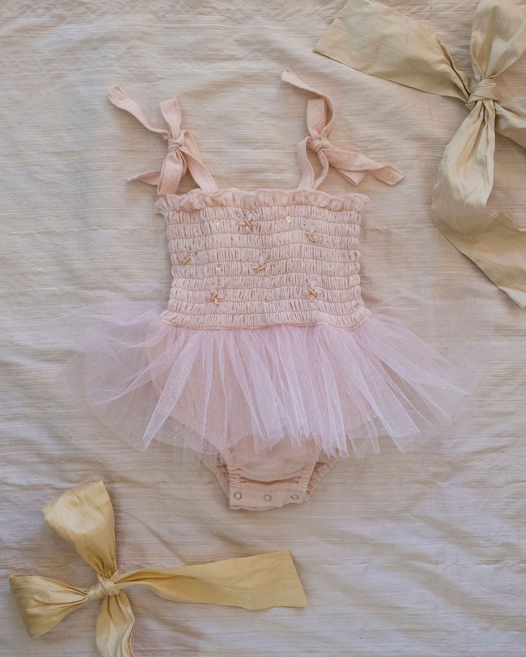 Our Butterfly Tutu is a dreamy little piece made for twirling through sunshine, garden adventures, and magical childhood moments. Delicate butterfly accents flutter across the soft smocked bodice, creating a whimsical look that feels straight out of a storybook.