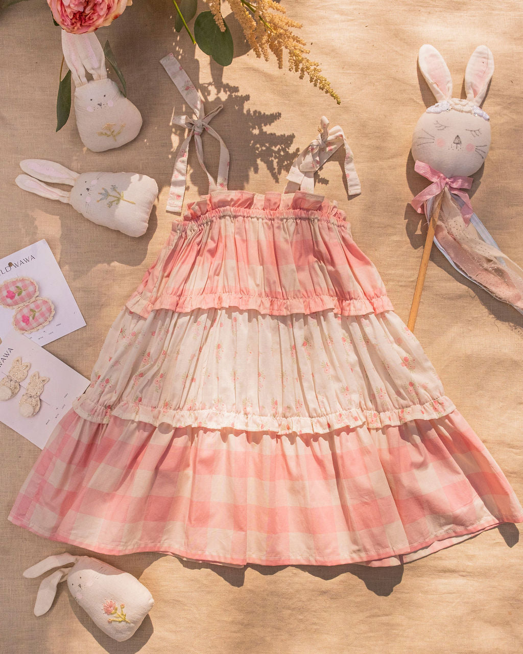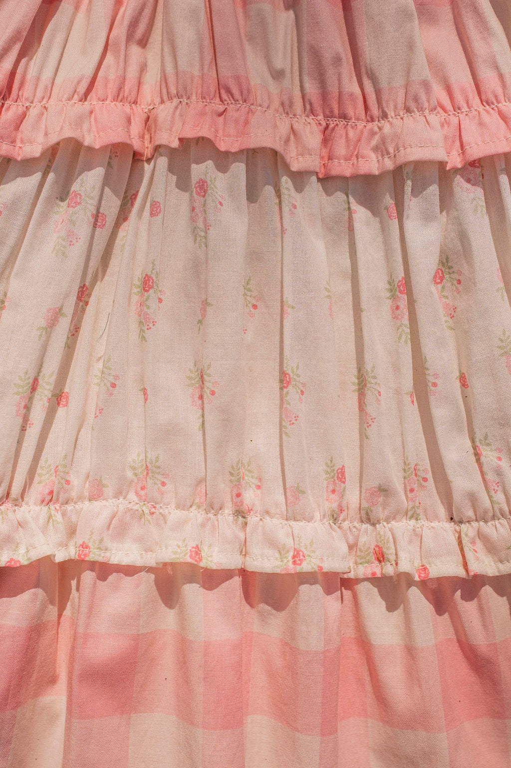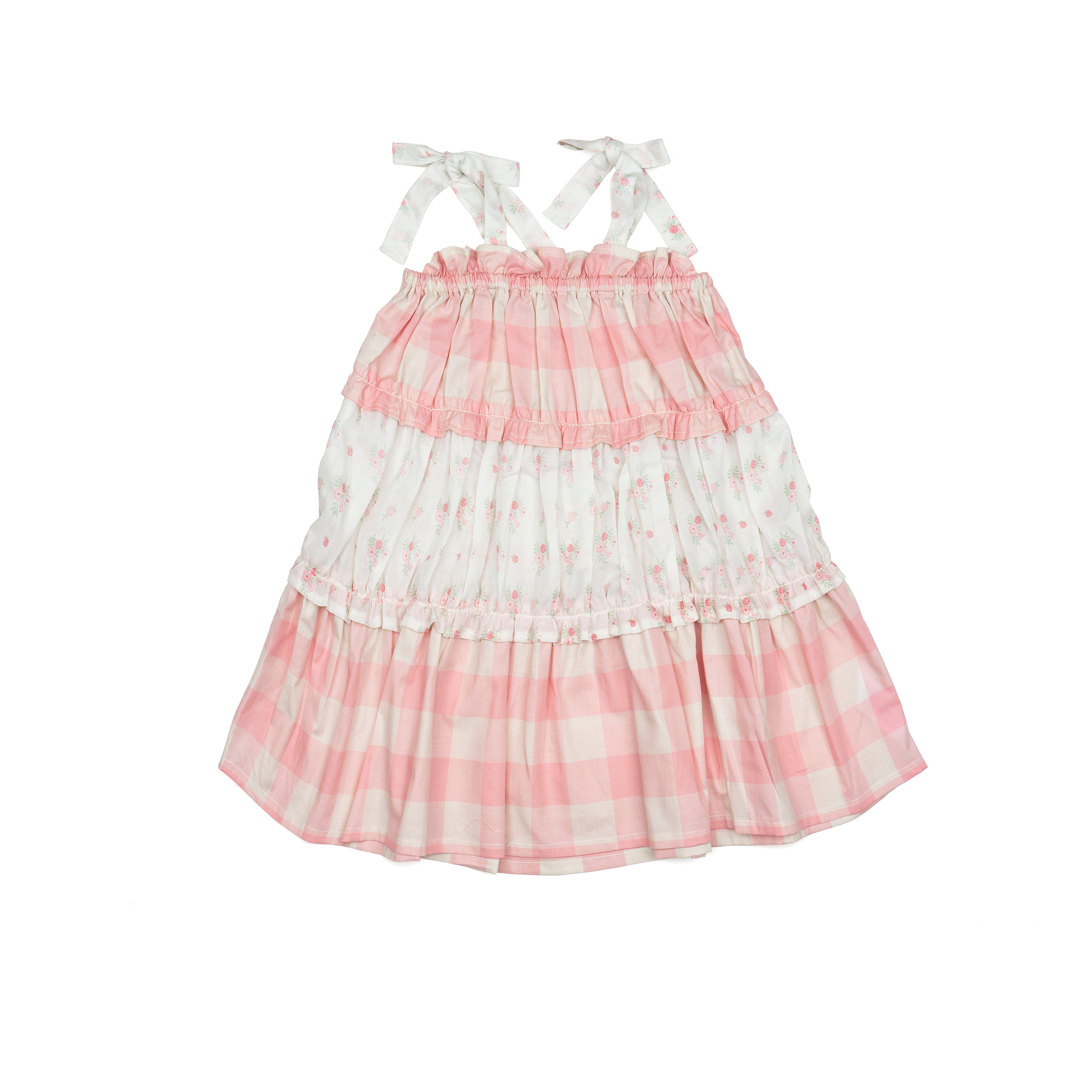 • Tiered design alternates between gingham and delicate broderie anglaise layers for a romantic heirloom feel