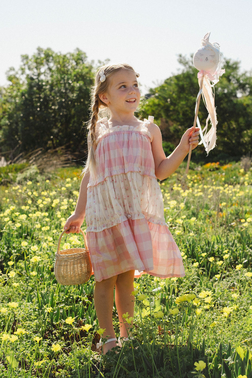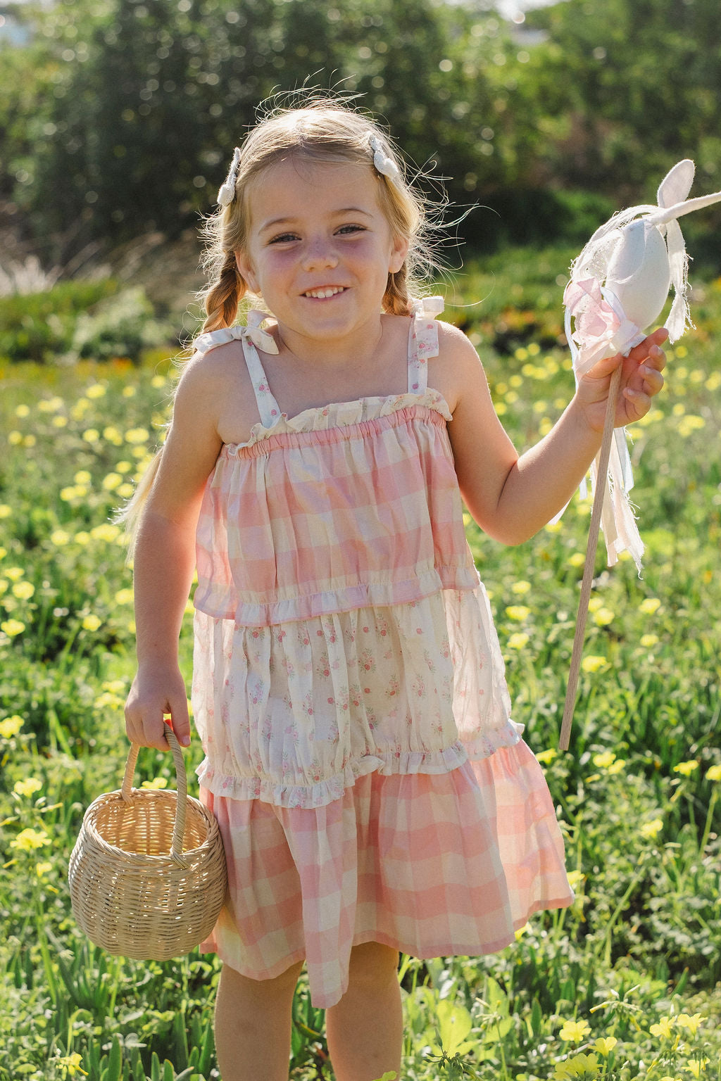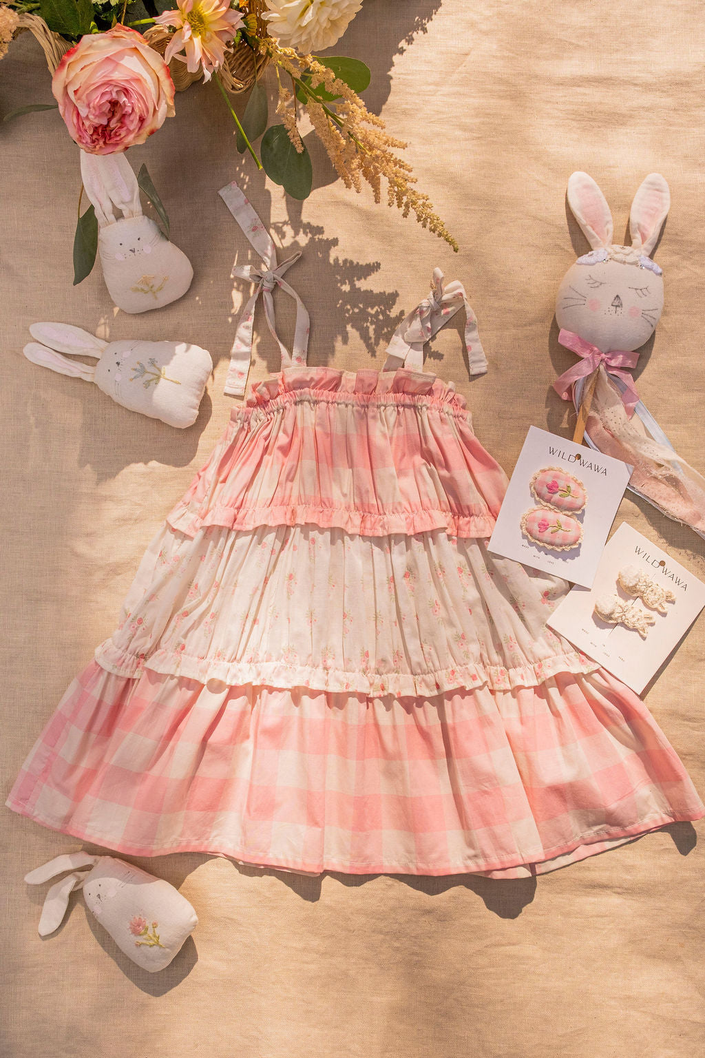 • Tiered design alternates between gingham and delicate broderie anglaise layers for a romantic heirloom feel