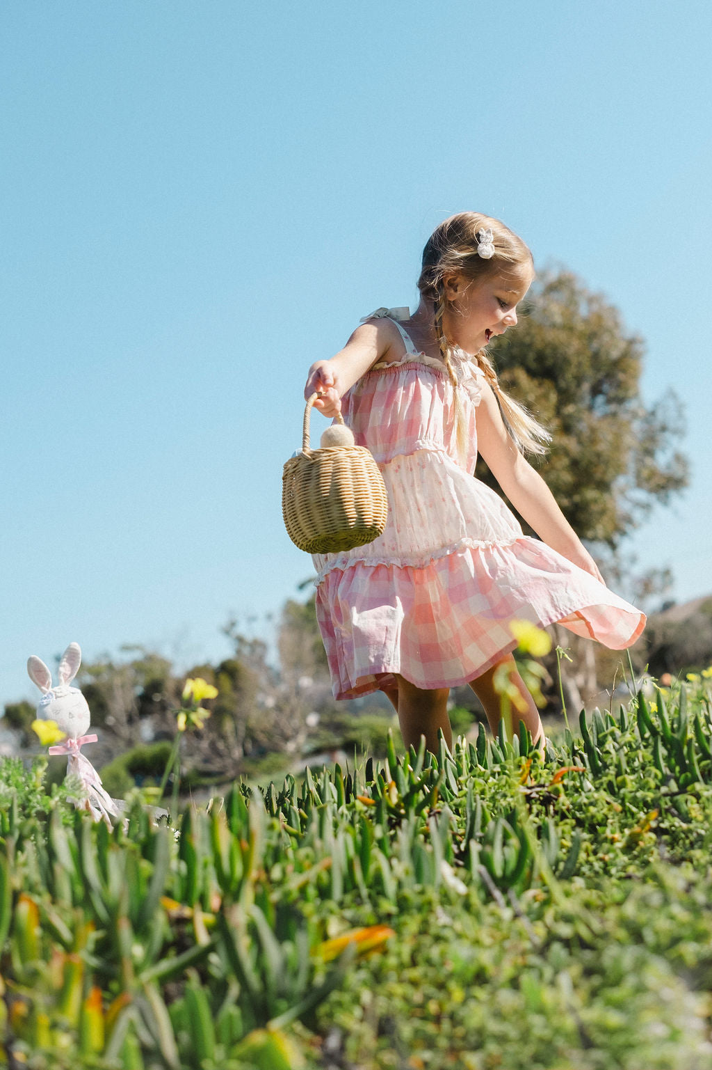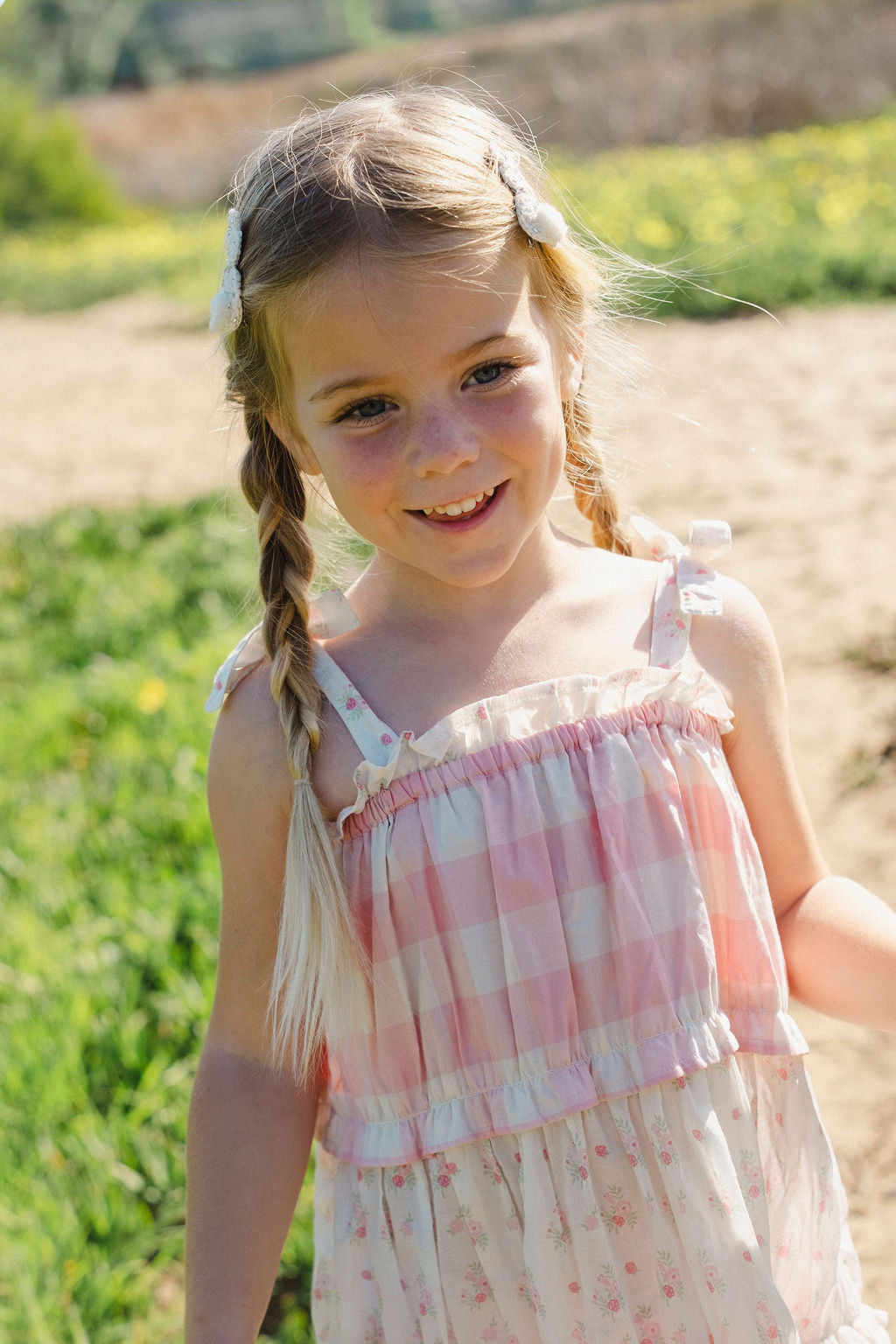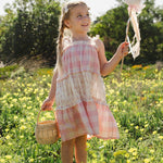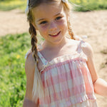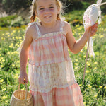 A dress that captures the joy of childhood in every detail. Our Amber Dress in Pink Gingham features our bestselling silhouette that customers return to season after season, now in a sweet, classic gingham print that feels fresh and timeless all at once. The tiered design alternates between soft pink gingham and delicate broderie anglaise layers, creating a romantic, heirloom feel that's both playful and elegant. Easy adjustable tie straps ensure a perfect fit that grows with your child, while the flattering A-line silhouette flows beautifully with every movement. Crafted in soft, airy cotton gauze, this dress works effortlessly from season to season—wear it on its own for warmer days or layer it with our long-sleeve ribbed top when there's a chill in the air. Made slowly and with intention in Peru, it's a piece that feels special every time she wears it.