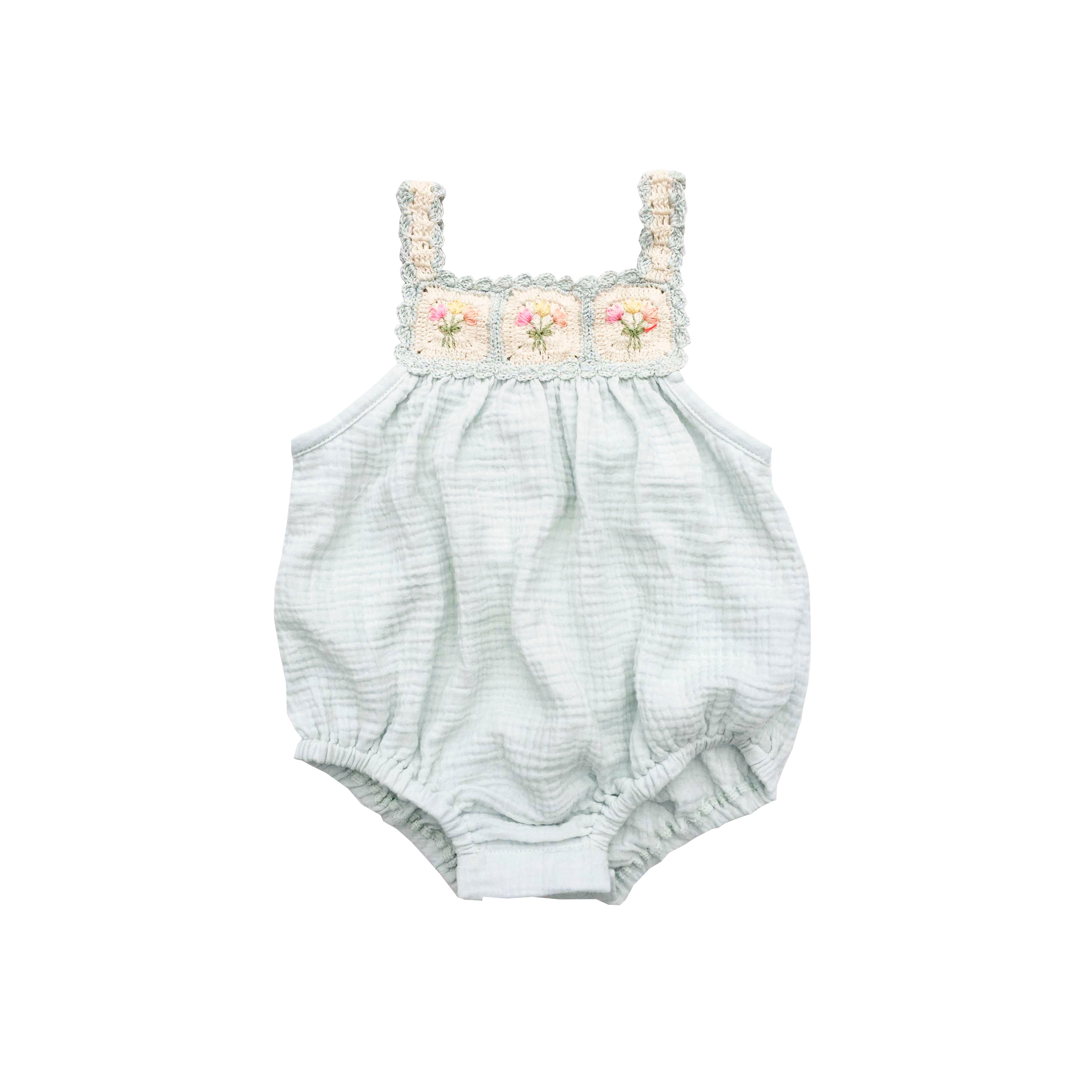 The sweetest little bubble for the sweetest little ones. Our Crochet Bubble in Blue Bouquet is a true heirloom piece, thoughtfully made to be worn, loved, and treasured for years to come. The hand-crocheted chest panel is adorned with a delicate, hand-embroidered bouquet motif, carefully stitched by hand to make every piece feel one of a kind. Adjustable shoulder tie straps ensure a comfortable, flexible fit that grows with your baby, while the gathered leg openings create that signature bubble shape we all love. Crafted in a dreamy pastel seafoam blue with soft, breathable cotton gauze, this bubble feels gentle on delicate skin and perfect for those early days of crawling, playing, and discovering the world. Made slowly and with love in Peru, this is the kind of timeless piece you'll want to save in the memory box and pass down for generations to come.
