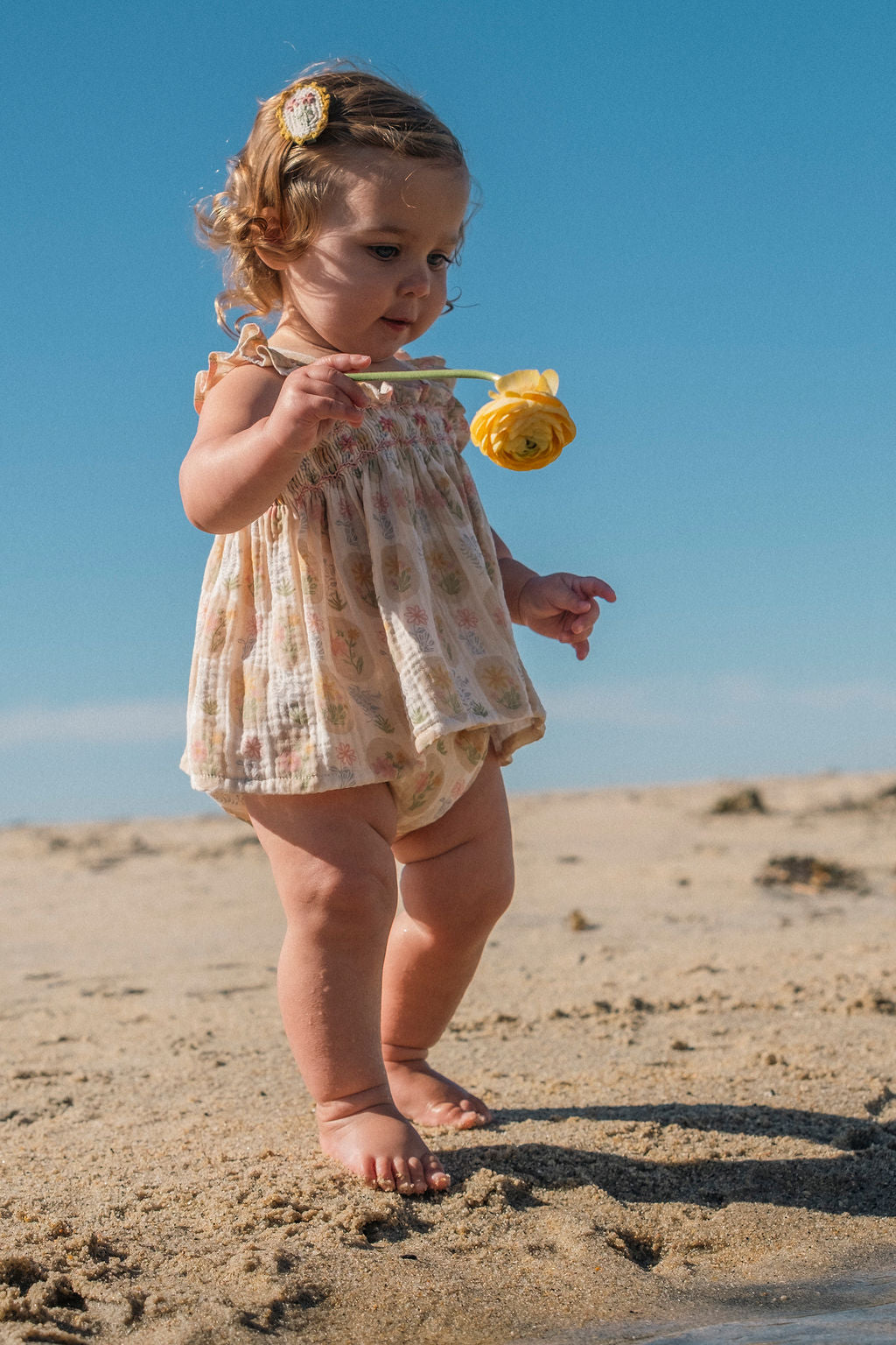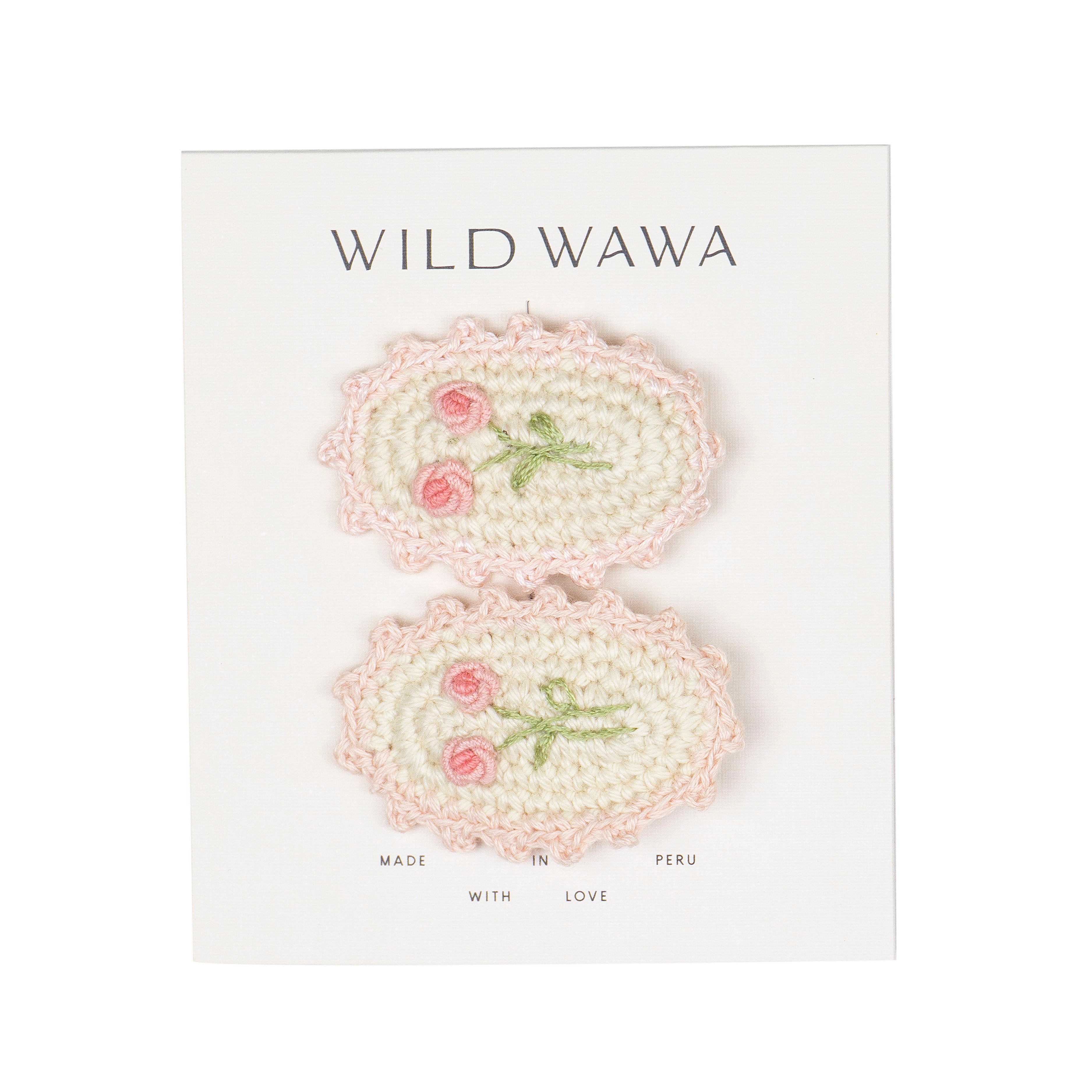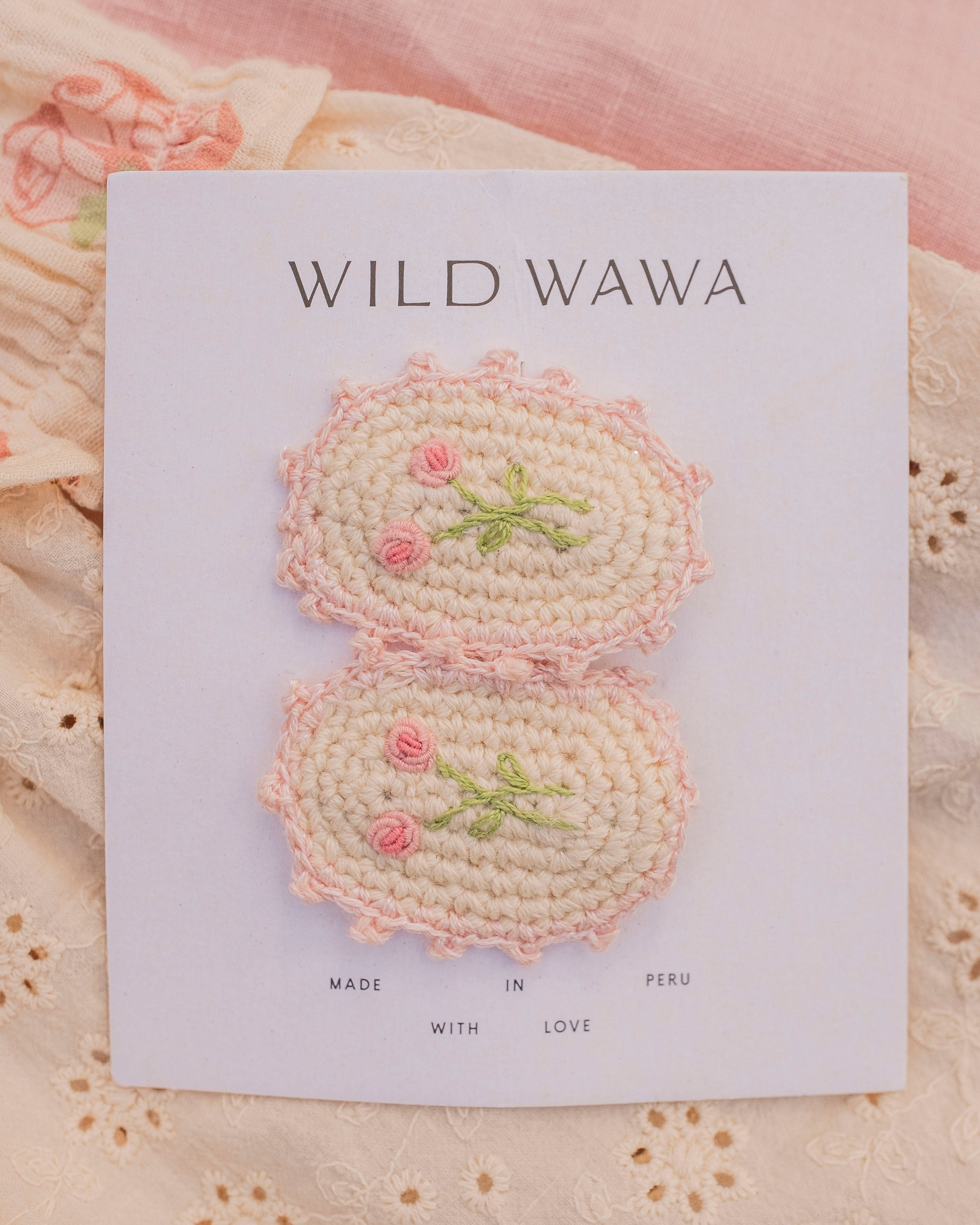 Sometimes the smallest details make the biggest impression. Our Crochet Clip Set in Pink Rose is a sweet way to add a touch of heirloom charm to any outfit. Each clip features a delicate hand-crocheted rose with carefully embroidered details, creating a soft, dimensional design that feels timeless and special. The set comes with two clips, perfect for tucking into braids, pinning back wispy hair, or adding a whimsical touch to ponytails and buns. Finished in a dreamy pink palette that echoes our hand-drawn Pink Rose print, these clips bring a gentle sweetness to your little one's look while pairing beautifully with everything in their wardrobe. They're lightweight, gentle on fine hair, and made to be worn over and over again. Handmade slowly in Peru, this is the kind of accessory that turns everyday moments into something a little more memorable.