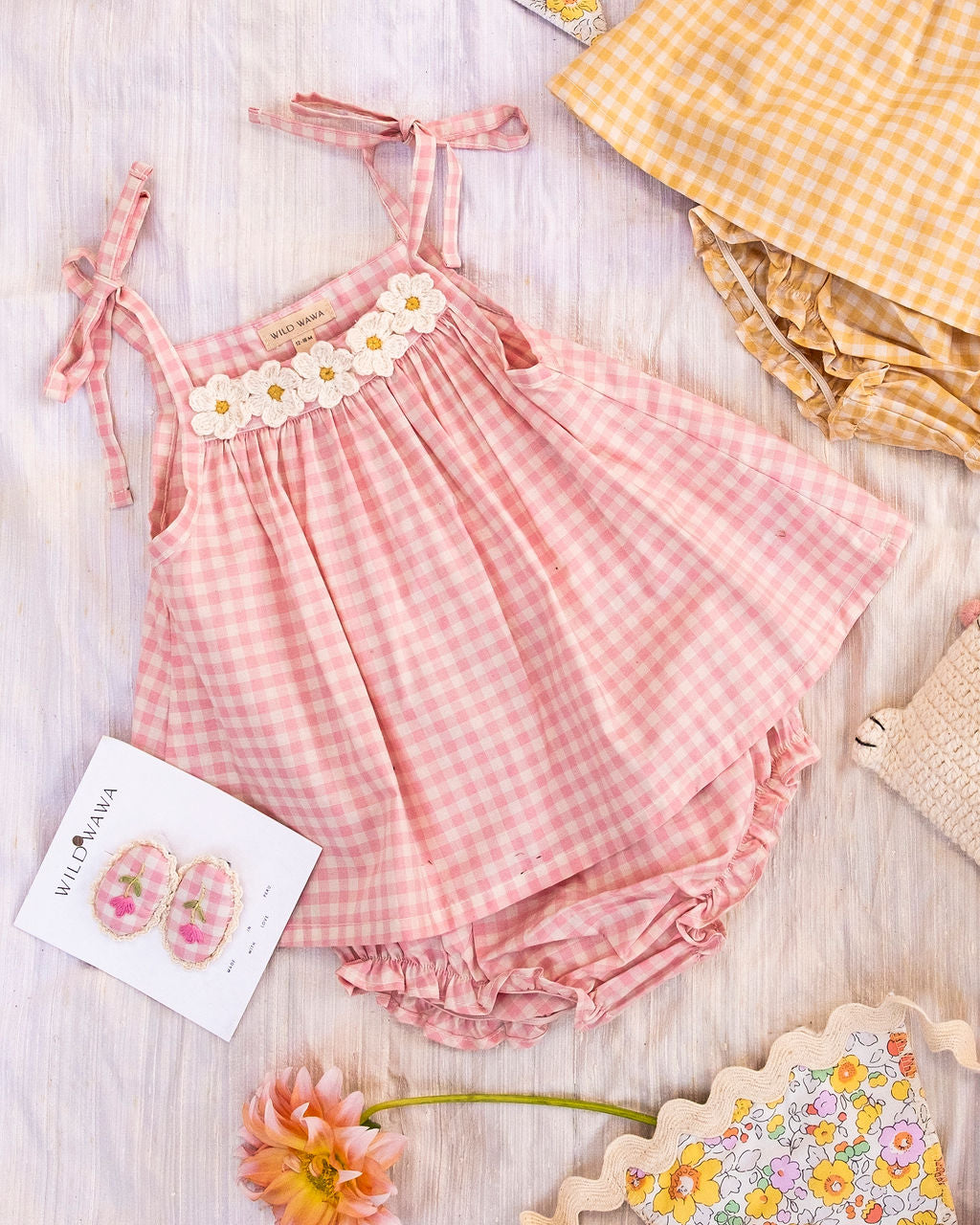 Sometimes the smallest details make the biggest impression. Our Crochet Clip Set in Pink Gingham is a sweet way to add a touch of charm to any outfit. Each clip features a hand-crocheted bow in soft pink gingham, carefully crafted with attention to detail and sweetness. The set comes with two clips, perfect for tucking into braids, pinning back wispy hair, or adding a playful touch to ponytails and buns. The classic gingham pattern feels fresh and timeless, bringing a sense of joy and lightness to your little one's look. They're lightweight, gentle on fine hair, and made to be worn over and over again. Handmade slowly in Peru, this is the kind of accessory that turns everyday moments into something a little more memorable.