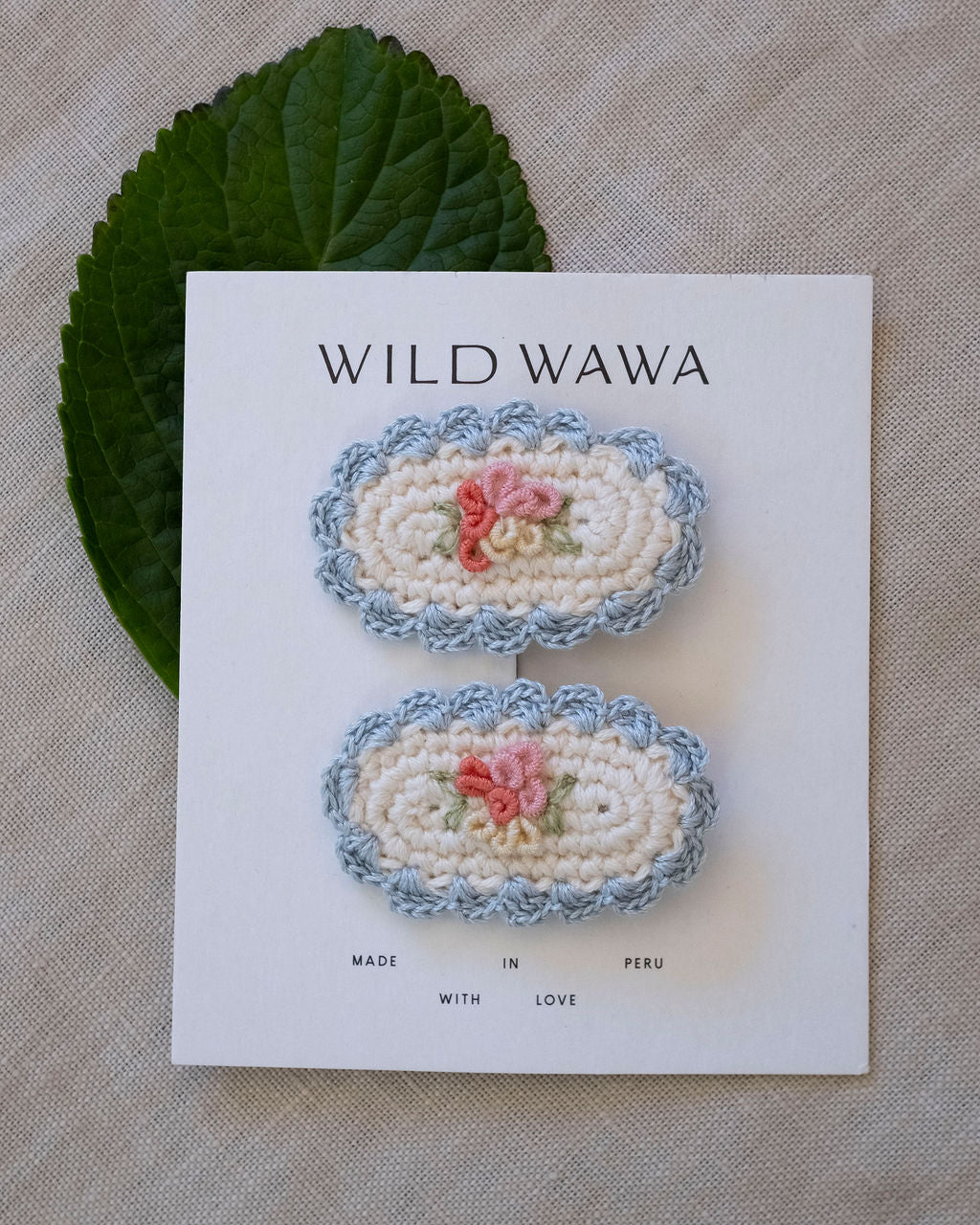 The perfect finishing touch for any look. Our Crochet Clip Set in Ivory/Blue features delicate handmade crochet details that add a charming, artisanal element to your child's hair. The soft ivory and blue color combination feels fresh and versatile, complementing everything from everyday outfits to special occasion dresses.