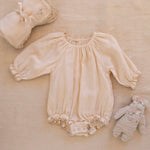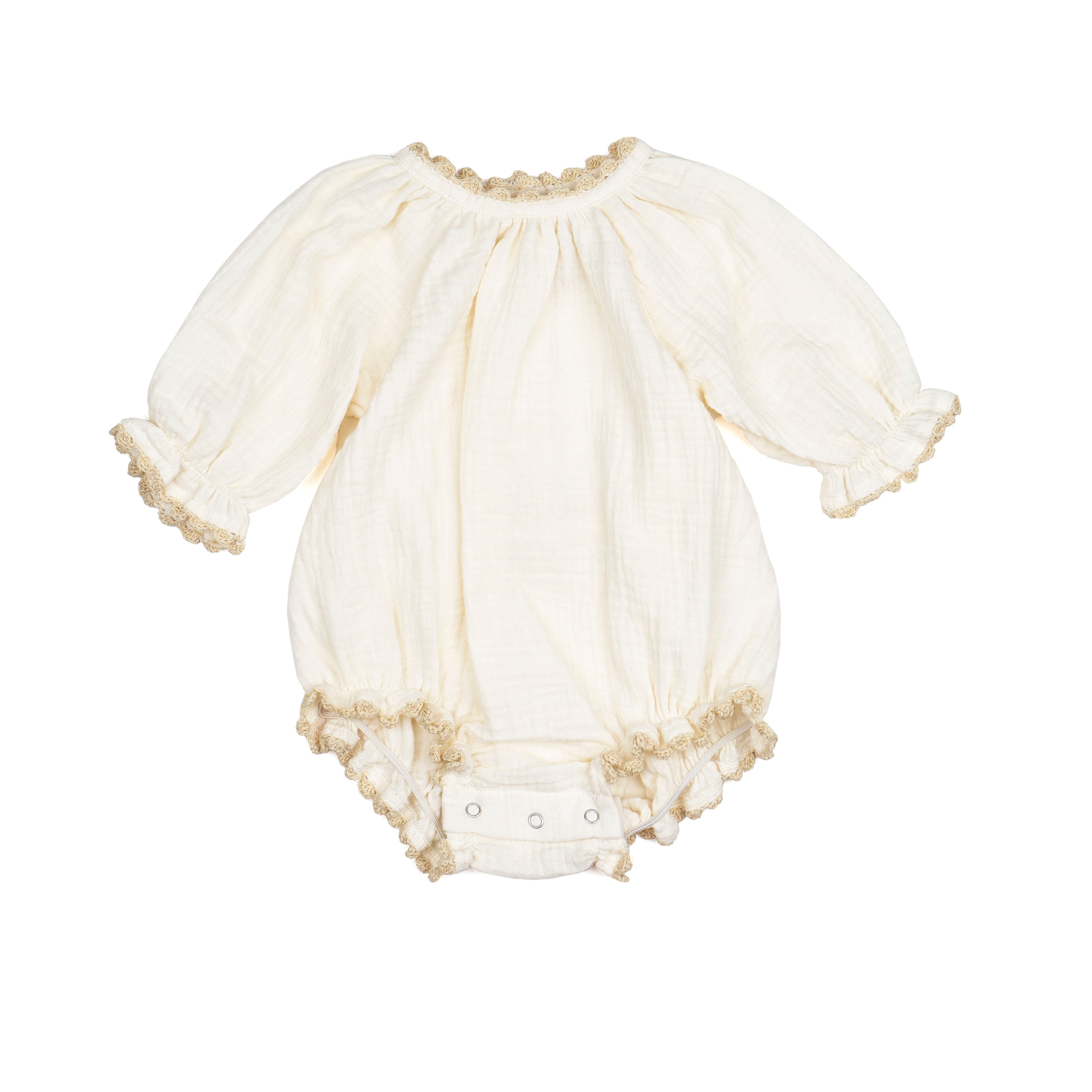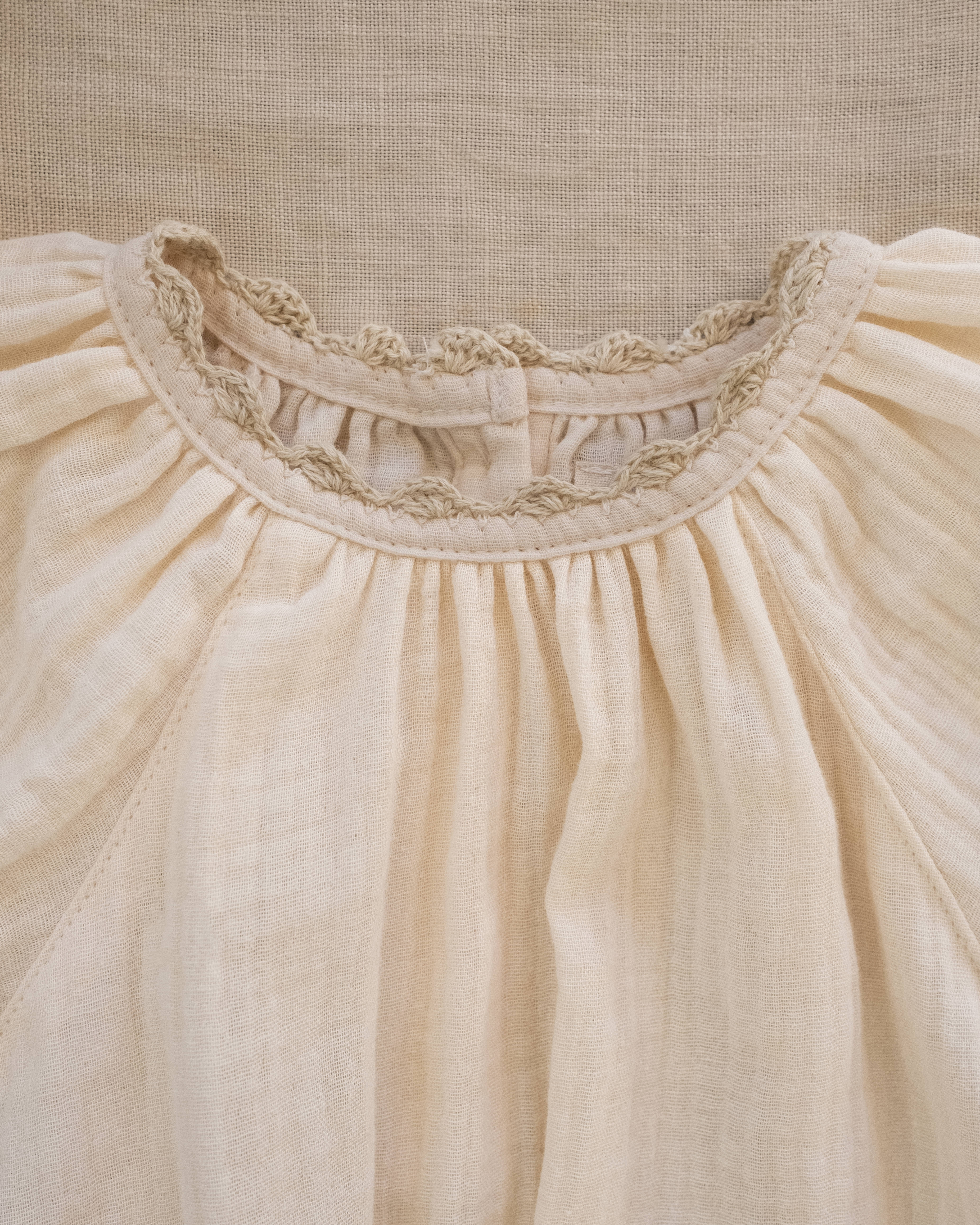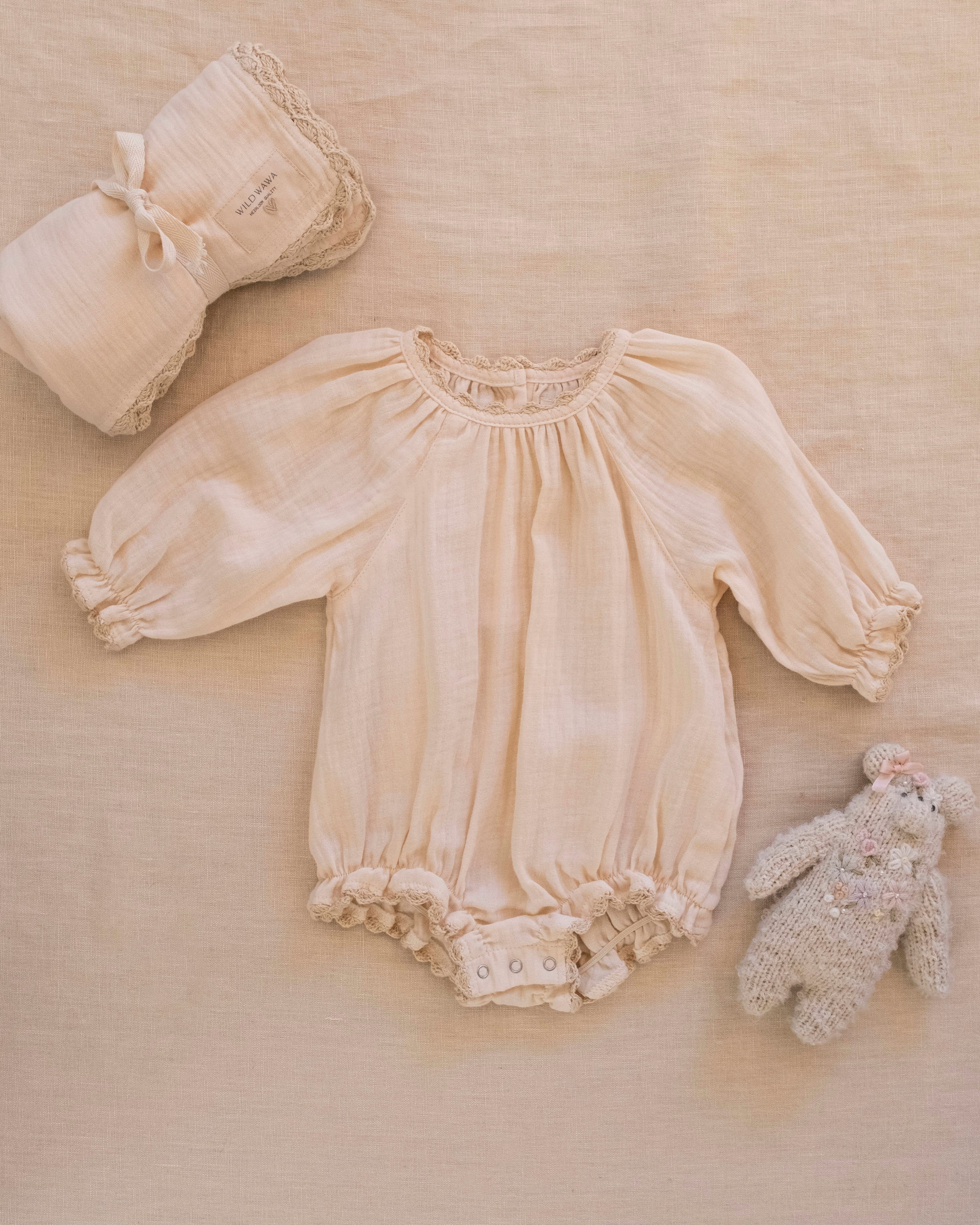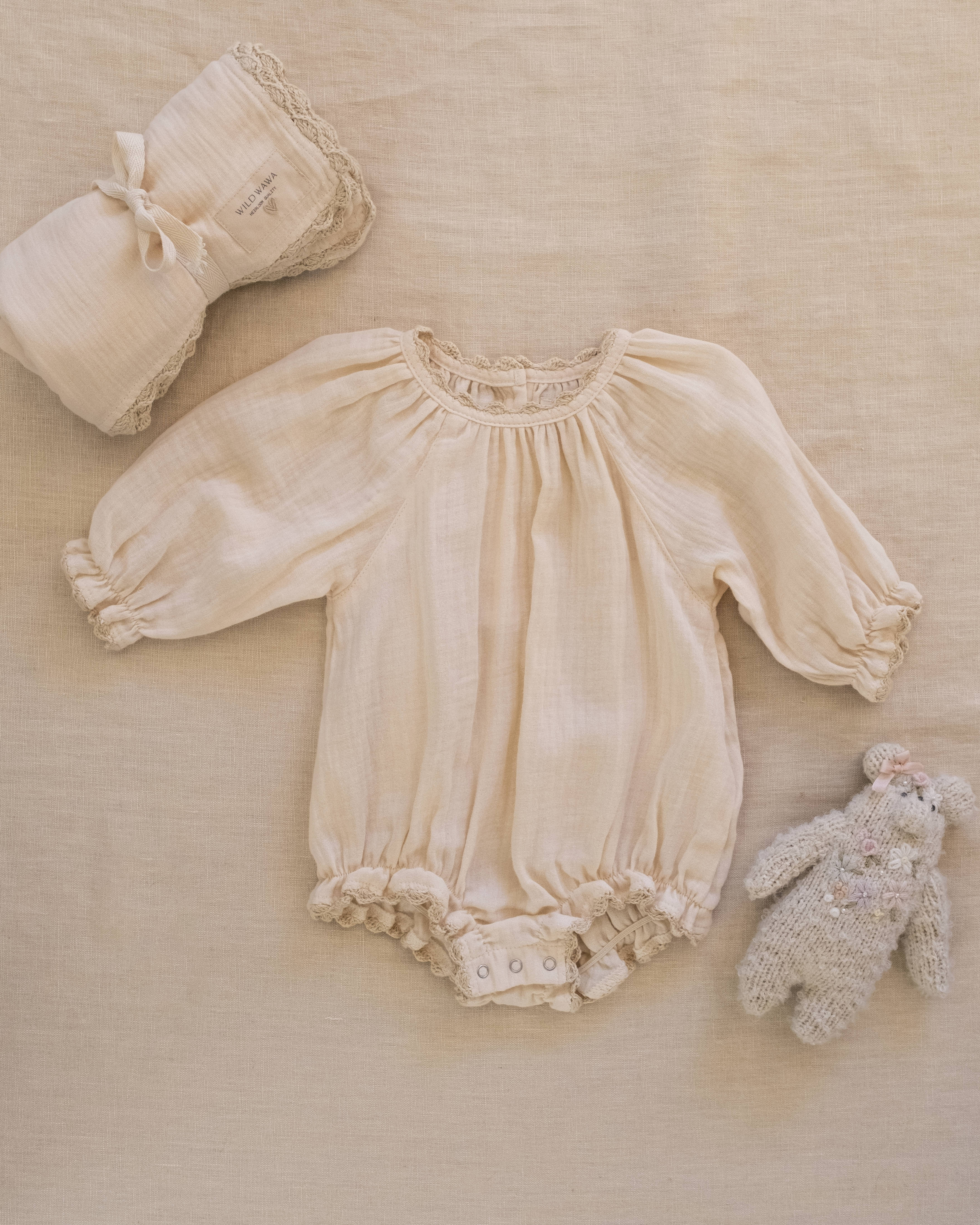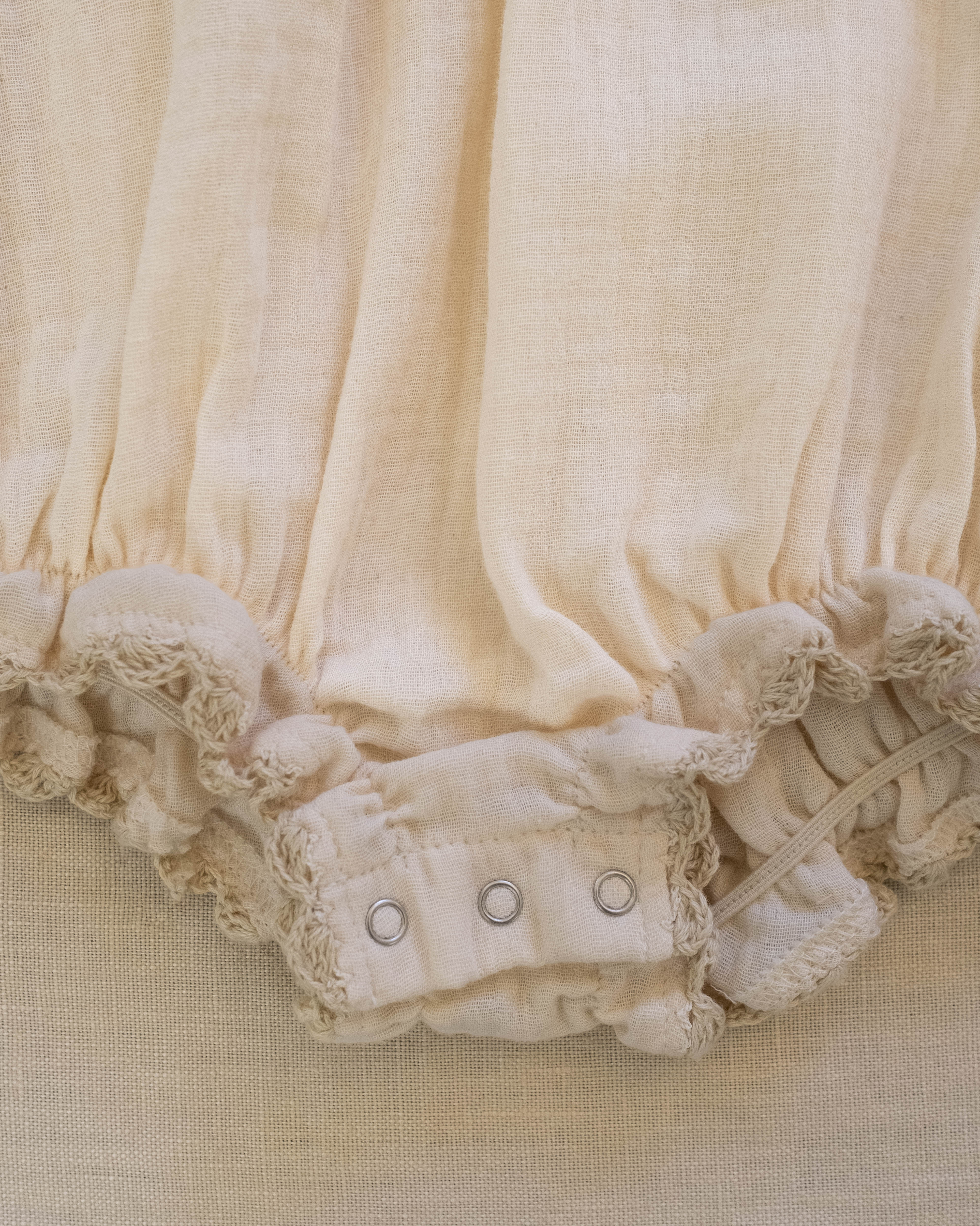 • Features delicate crochet trim at cuffs + leg openings adds a delicate finish