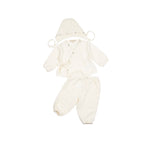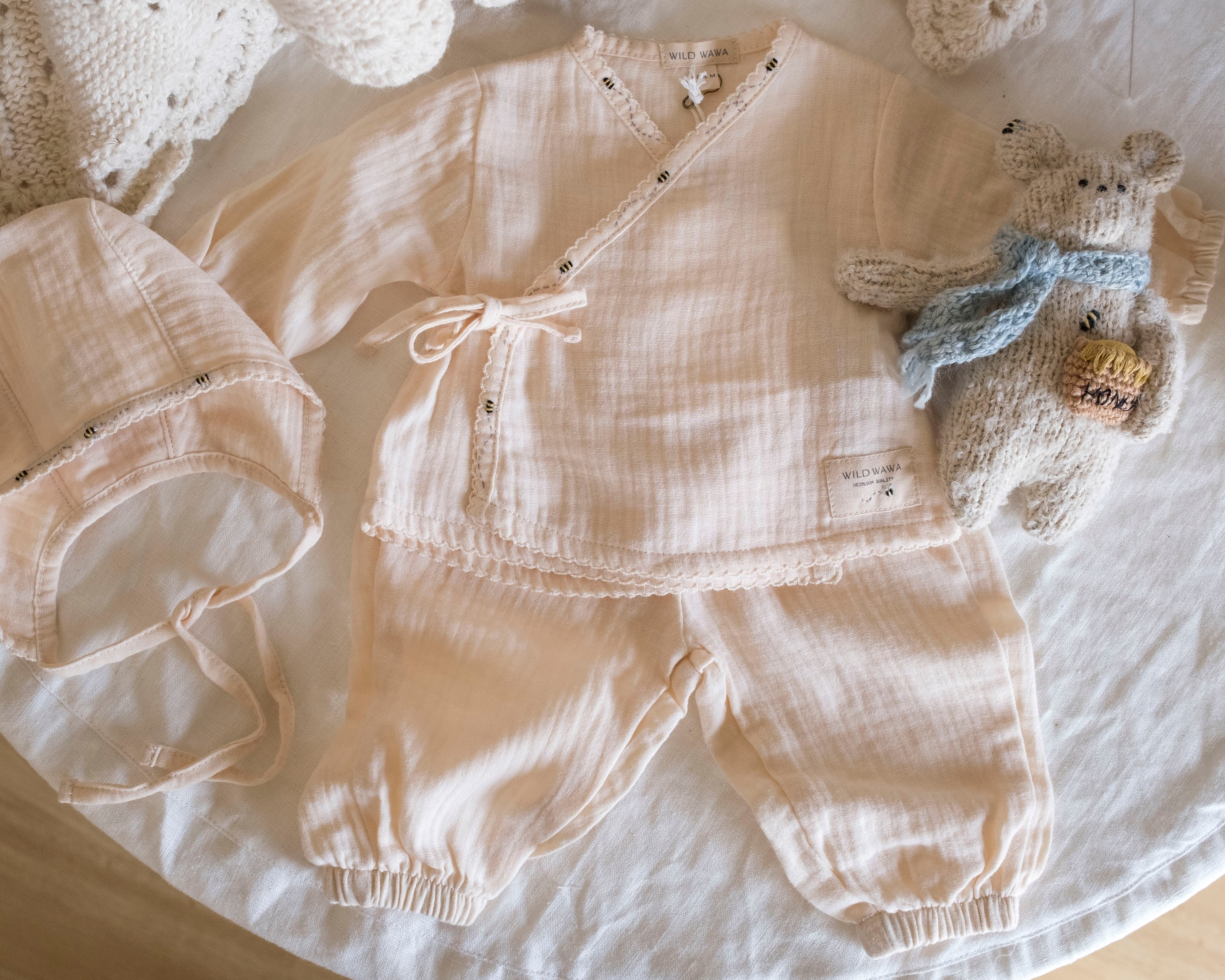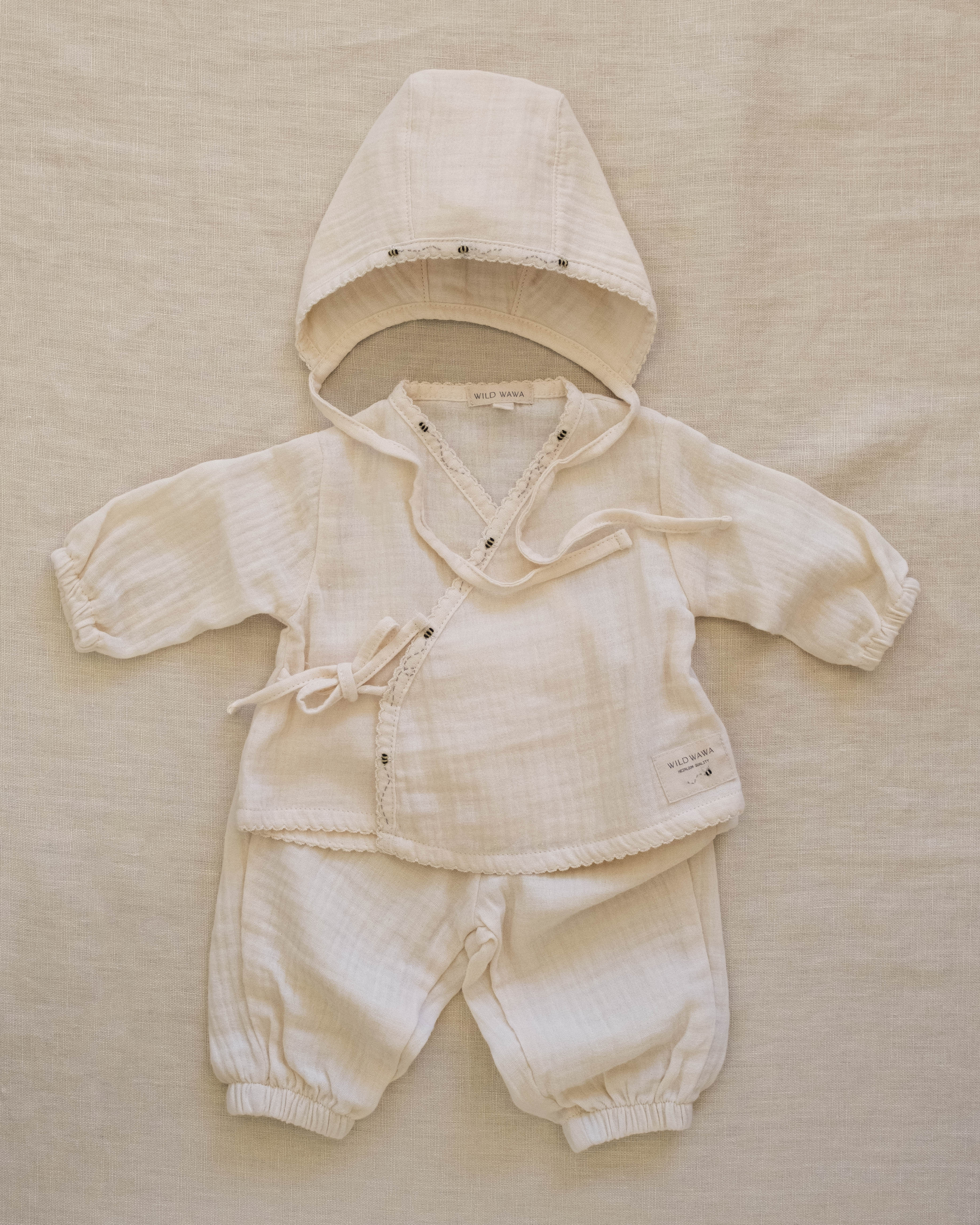 • 3-piece set includes a kimono-style top, footless pants + matching bonnet