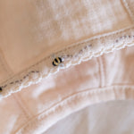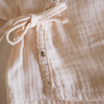 • Delicate hand-crocheted trim along neckline + sleeves for a timeless heirloom touch