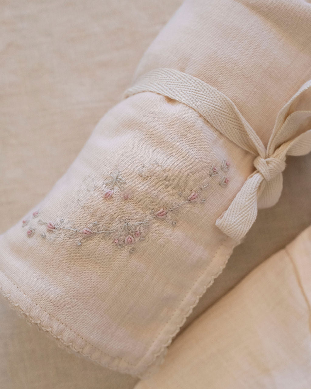 • Delicate floral embroidery in blush and ivory tones
